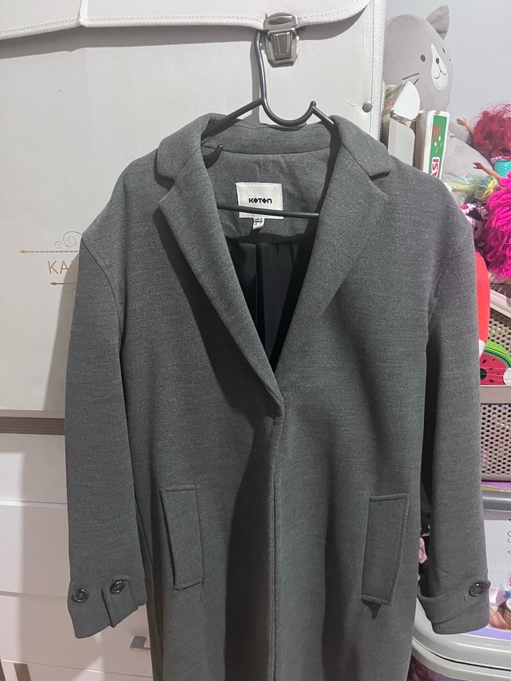 Gri renkte, klasik yakalı, ön cepli ve düğmeli manşetli kaban. İç kısmı rahat kullanım için astarlıdır.