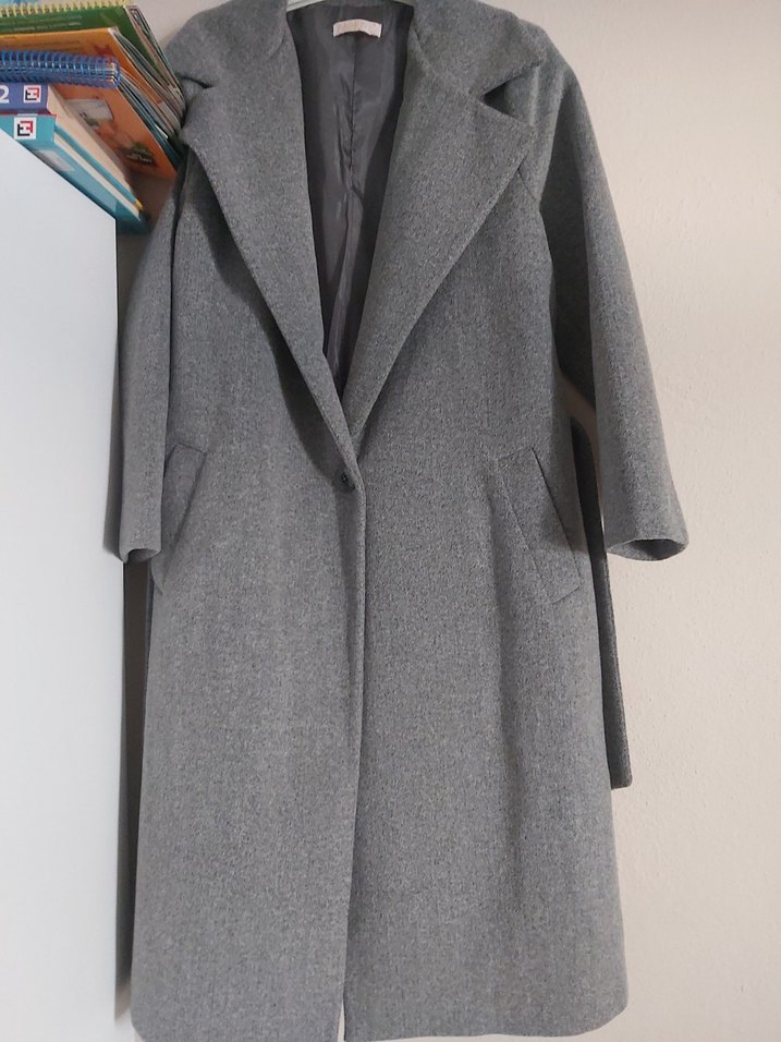 Geniş yakalı, yan cepli, düz kesim uzun gri kaban. İç kısmı astarlıdır ve tek düğmeli kapanışı vardır. marka temsili