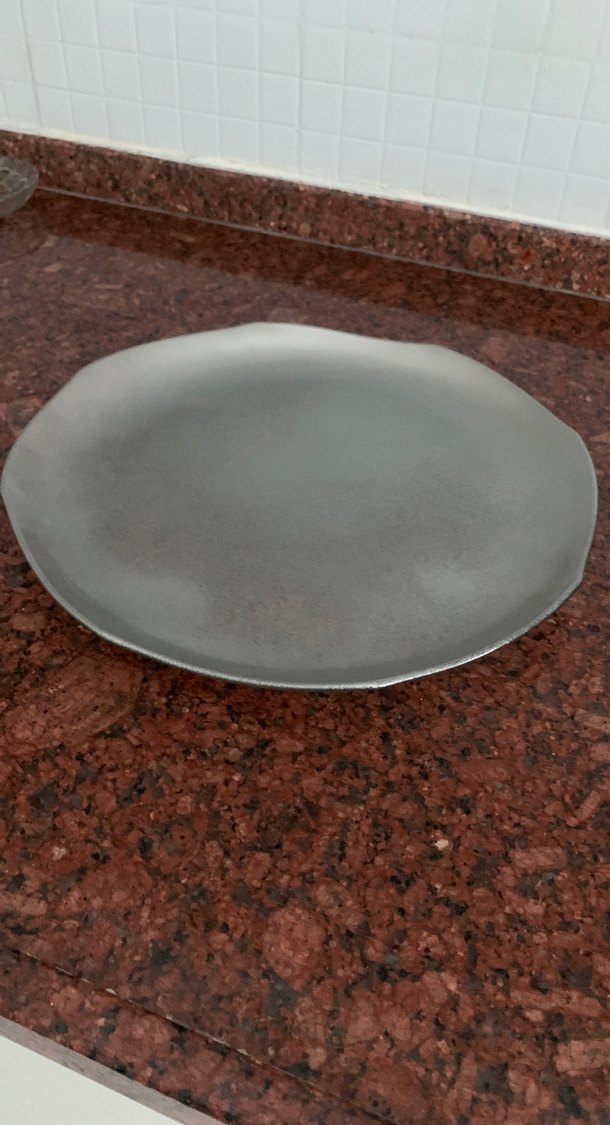 Düz gri renkte, hafif düzensiz kenarlı, modern ve minimalist tarzda tabak. Paşabahçe tepsi veya sunum tabağı