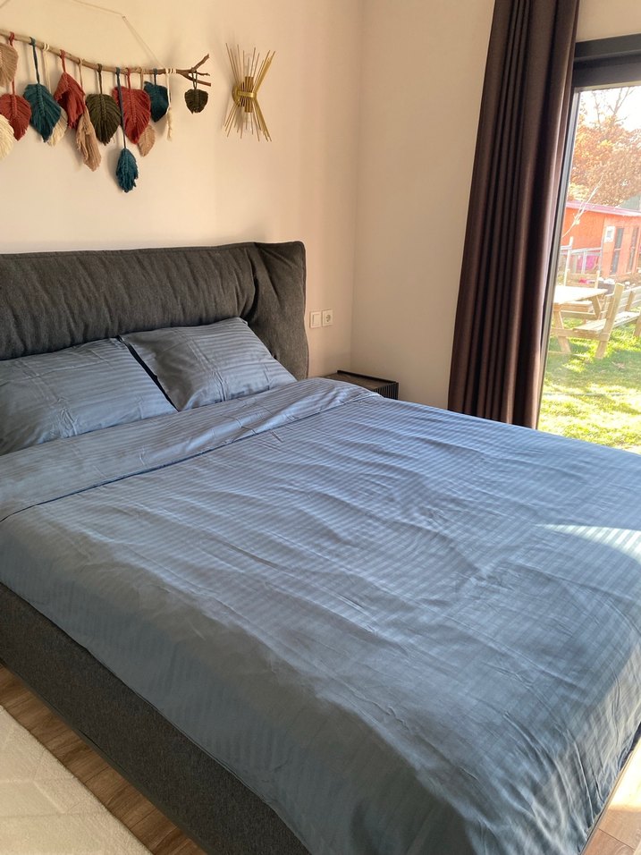 Gri renkte, desensiz ve düz tasarımlı yatak örtüsü, yatak üzerinde düzenli ve şık bir görünüm sağlar.