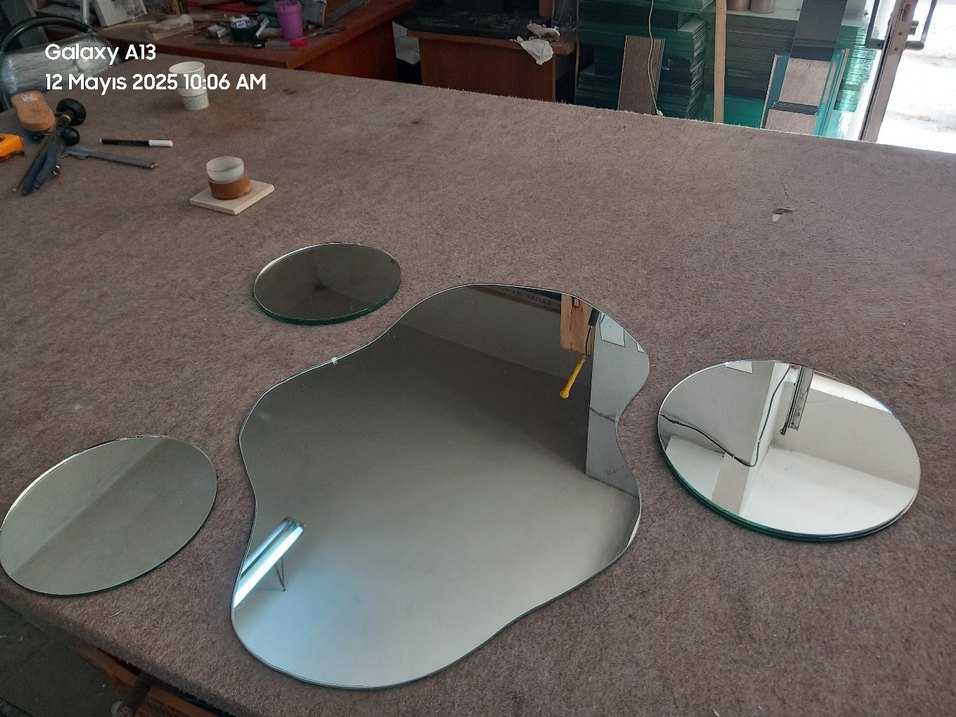 Düzensiz şekilli gri ayna, çevresini net şekilde yansıtıyor. Yüzeyi pürüzsüz ve modern görünüyor. Görüntüde "6AM" yazısı yer alıyor.