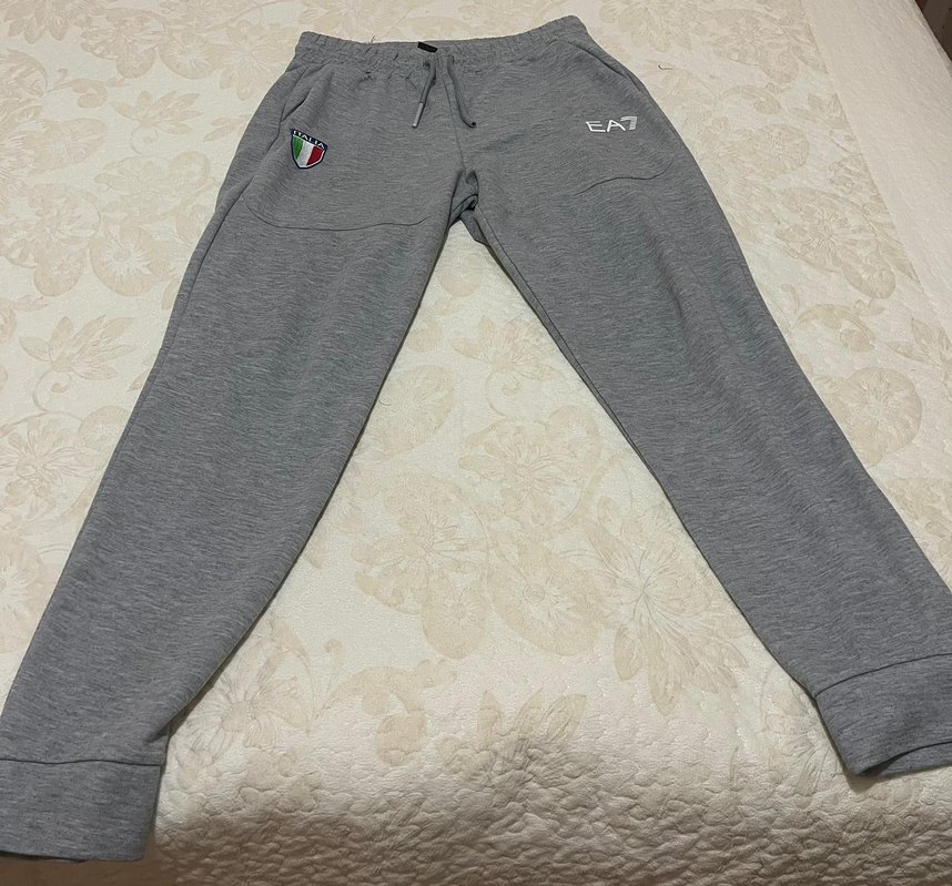 Gri EA7 erkek eşofman altı, bol kesim ve fermuarlı ceplerle, yumuşak ve sıcak kumaştan, spor ve günlük sokak stili için uygundur. ♀️