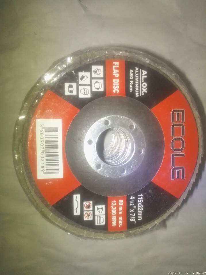 Ecole flap disc, 115x22mm boyutlarında gri renkli aşındırıcı disk, 13.300 RPM maksimum hızda çalışır, alüminyum oksit malzemeden üretilmiştir. ⚙️
