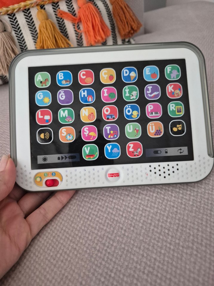 Renkli harf düğmeleri ve sesli etkileşimli özelliklere sahip gri eğitim oyuncağı tablet, çocukların harfleri öğrenmesine yardımcı olur.