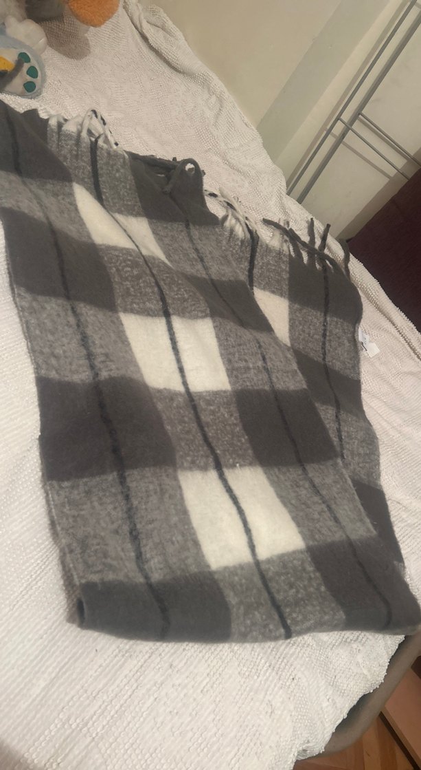 Gri ekose desenli, püsküllü yumuşak ve sıcak şal, rahat anlar için ideal. Lefties marka