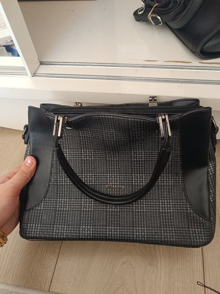 Gri ekose desenli deri kadın çanta çok az kullanıldı