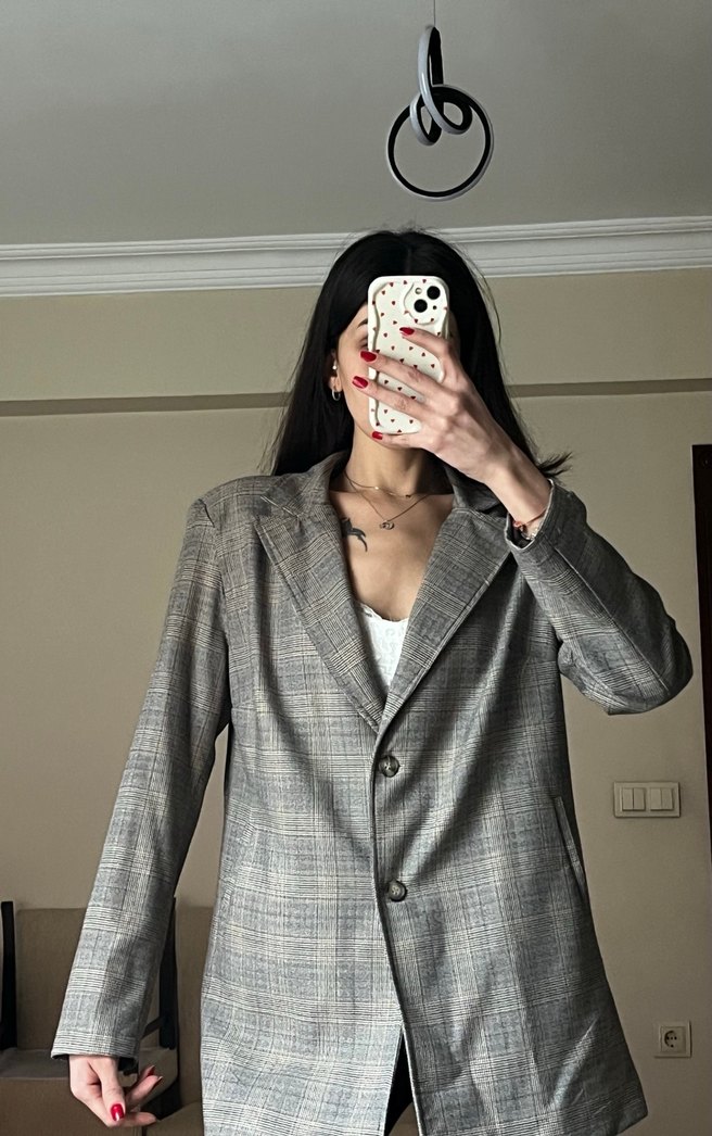 Gri renkli, ekose desenli, düğmeli ve uzun kollu kadın blazer. Normal kesim ve sentetik kumaştan, günlük kullanıma uygundur.