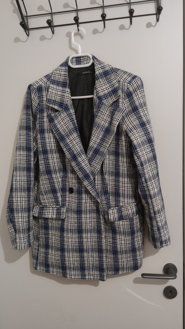 Kadınlar için gri ekose desenli, düğmeli ve normal kesim blazer. Uzun kollu ve sentetik kumaştan yapılmıştır, ofis ve günlük kullanım için uygundur.