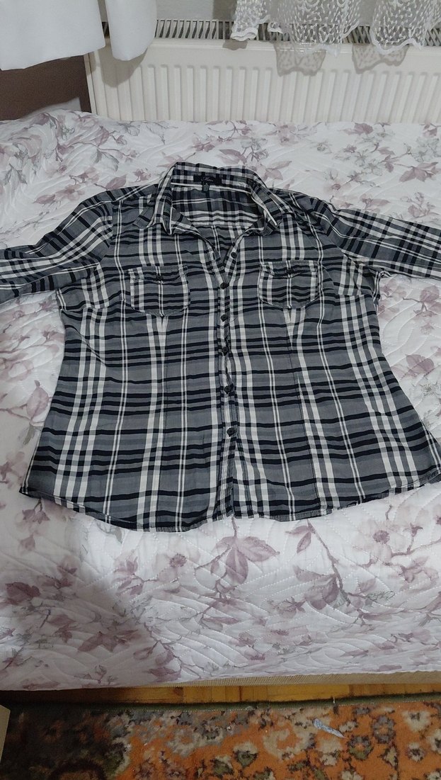Gevşek kesim, düğmeli, yakalı ve uzun kollu kadın gömleği. Yumuşak kumaştan, gri ekose desenlidir. Günlük sokak stili için uygundur. kunaşı kaliteli gri/siyah/beyaz renkler hakim koltuk altı 50 cm,asagı doğru bele doğru hafif daralarak 46 cm devam ediyor boy 64 cm..şık bir gömlek