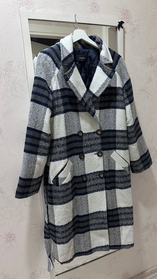 ekose desenli, düğmeli, yün kumaştan midi uzunlukta kadın kaban. Notlu yaka ve uzun kolludur, rahat kesimlidir. Günlük kullanım için uygundur.sıfır hiç kullanılmadı