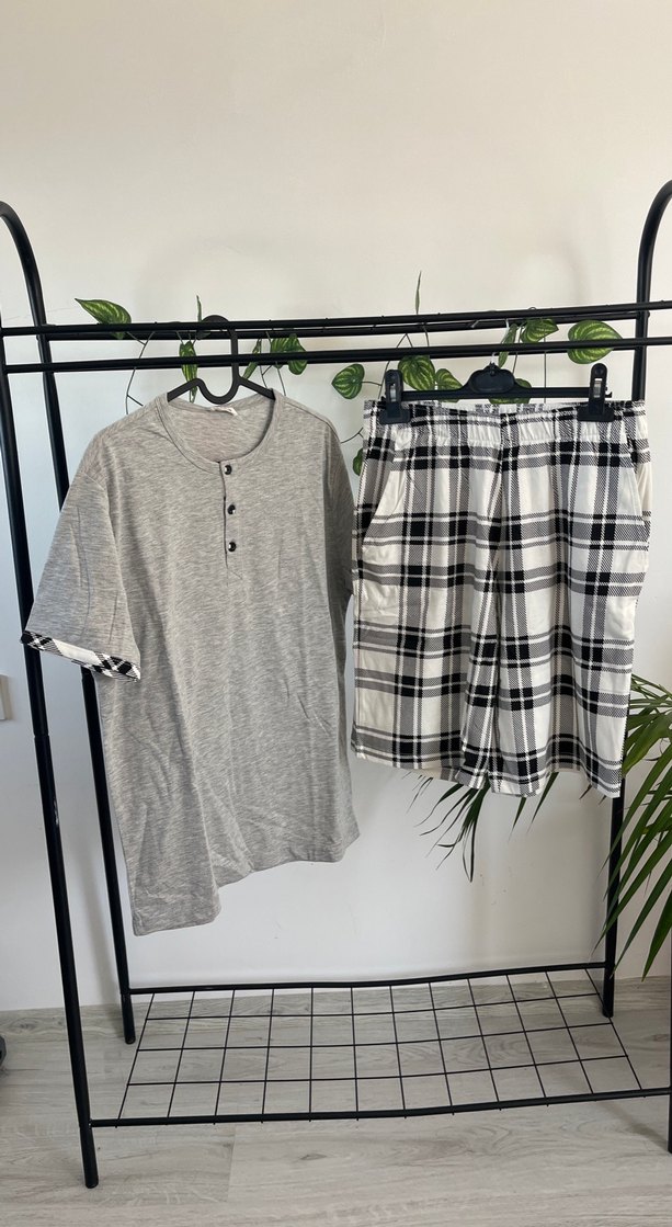 Gri kısa kollu, yuvarlak yakalı üst ve ekose desenli şortlardan oluşan, rahat ve şık erkek pijama takımı.