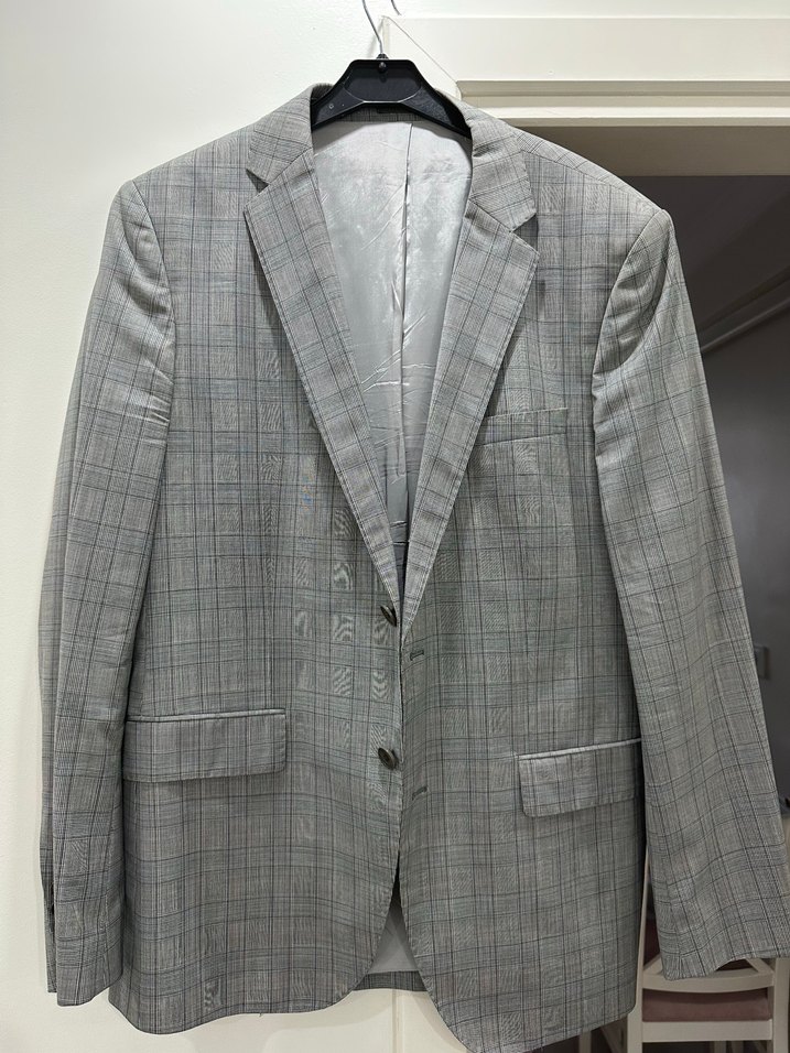 Gri ekose desenli, düğmeli erkek takım ceketi. Normal uzunlukta, klasik kesim ve uzun kolludur. İş ortamları için uygundur.