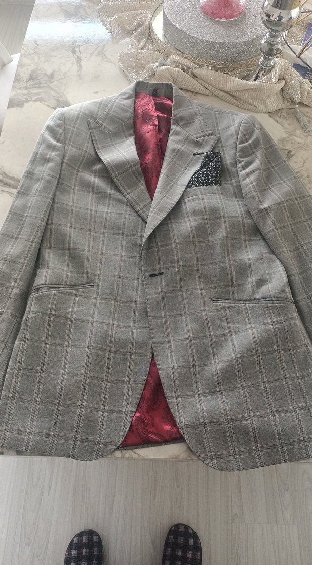 Gri ekose desenli, klasik yaka ve düğmeli erkek takım ceketi. Uzun kollu ve normal boyda, ofis ve günlük için uygun şık tasarım.