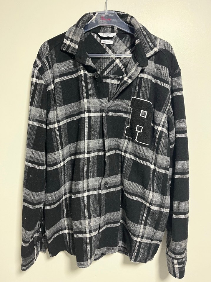 Gri ekose desenli, düğmeli ve uzun kollu erkek Gömlek. Notched yaka ve rahat bol kesim ile günlük rahatlık sağlar.
