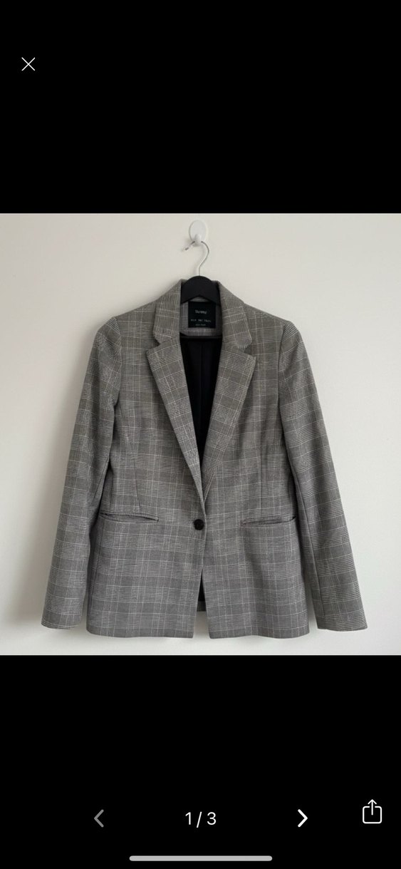 Gri ekose desenli blazer, kesik yaka ve düğmeli ön kapama ile tasarlanmıştır. Uzun kollu, normal boyda ve klasik şıklığa uygun, ofis için ideal bir modeldir.