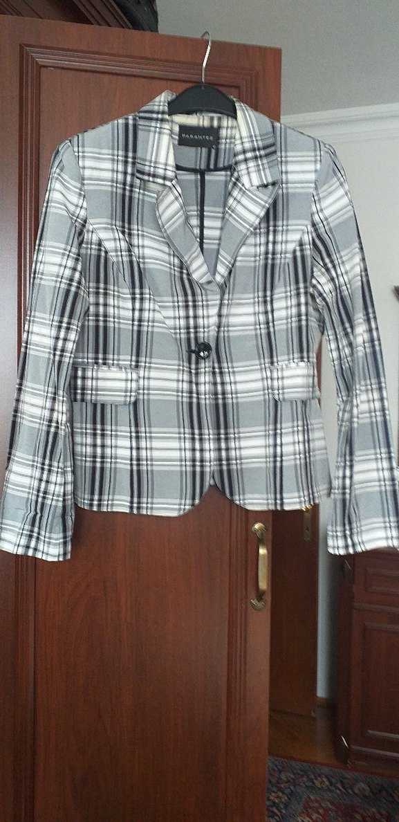 Gri ekose desenli kadın blazer ceket, düğmeli ve klasik kesime sahip. Uzun kollu ve midi boyda, ofis ve günlük kullanıma uygun şık bir parça.