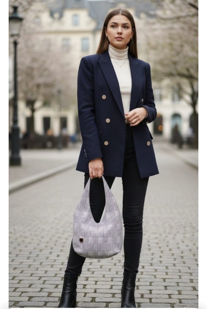 Gri ekose desenli, şişkin görünümlü denim kumaştan yapılmış kadın çantası, sokak stilini iş tarzıyla buluşturuyor.