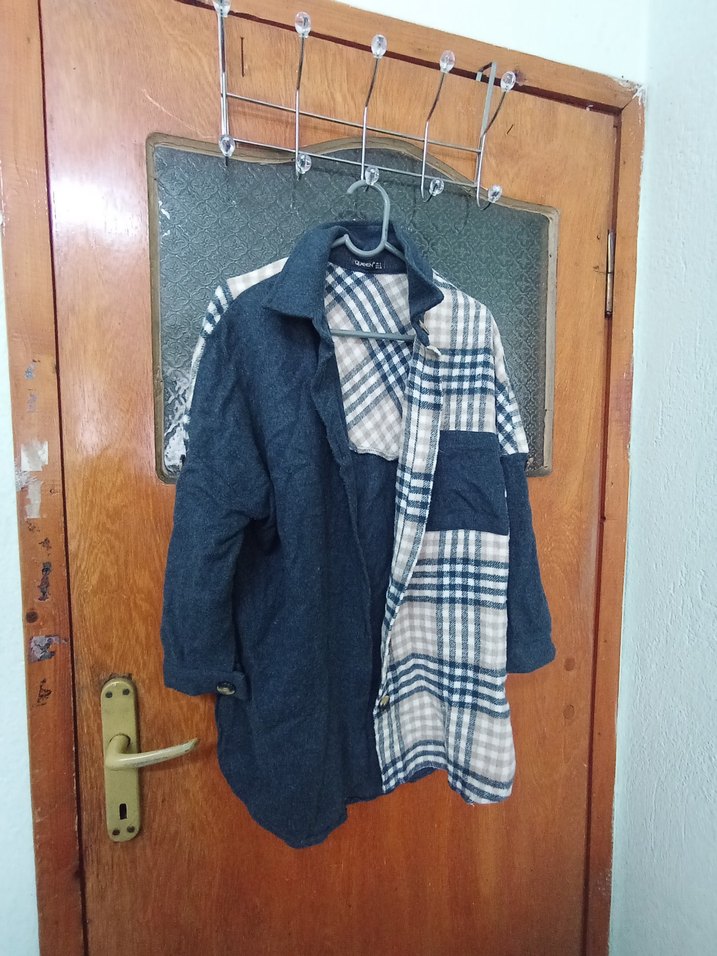 Düğmeli, gri ekose desenli kadın denim gömlek. Notlu yaka ve uzun kollu, bol kesim midi boyda, günlük rahat kullanıma uygun.