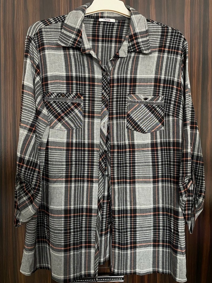 Gri ekose desenli, uzun kollu, düğmeli ve yakalı kadın gömleğidir. 48-52 beden arası için uyumludur.Rahat kesimi ve ön cepleriyle günlük sokak stili için uygundur.