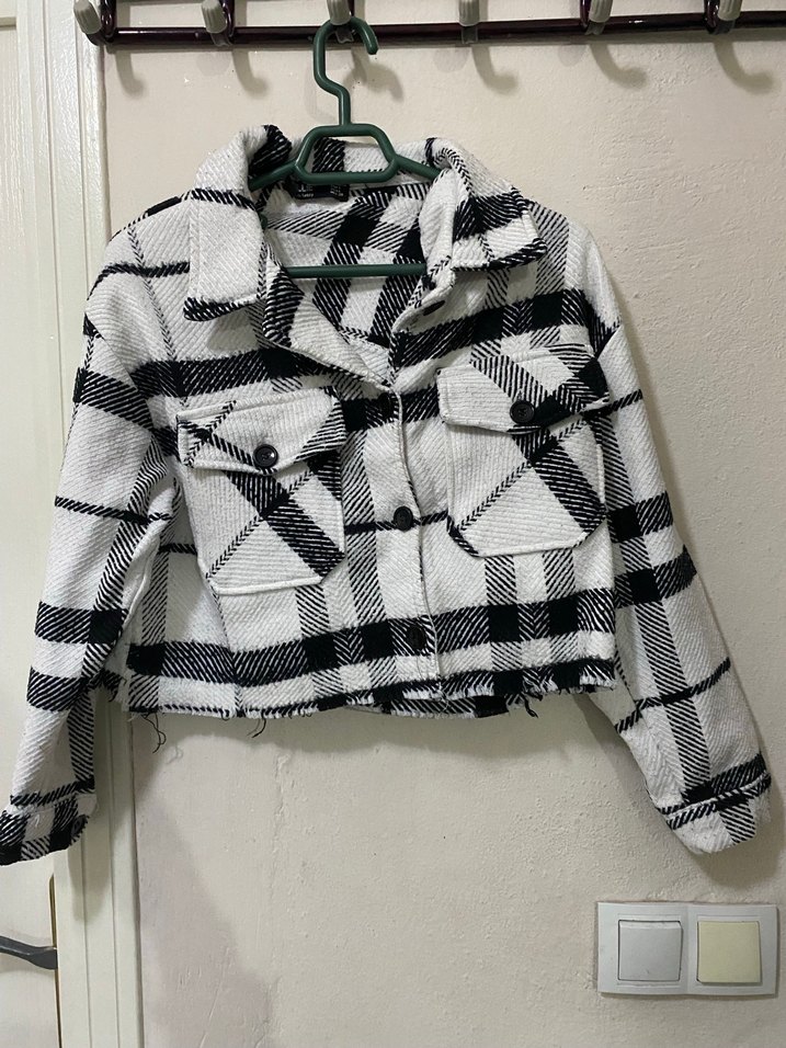 Pamuklu kumaştan, gri ekose desenli, düğmeli cepli, uzun kollu, bol kesim kısa kadın ceket. Notlu yaka detayıyla günlük sokak stiline uygun.