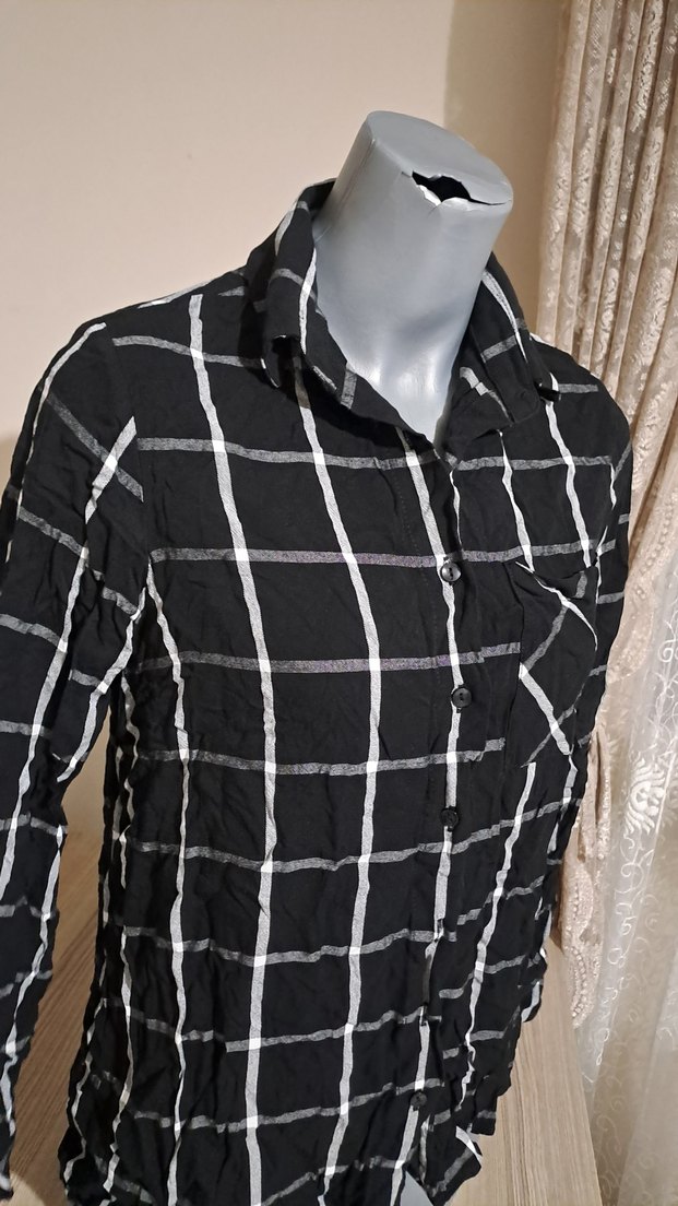 Gri pamuklu gömlek, uzun kollu, yakalı ve düğmeli ön tasarıma sahiptir. Ekose deseniyle rahat ve salaş bir görünüm sunar.
