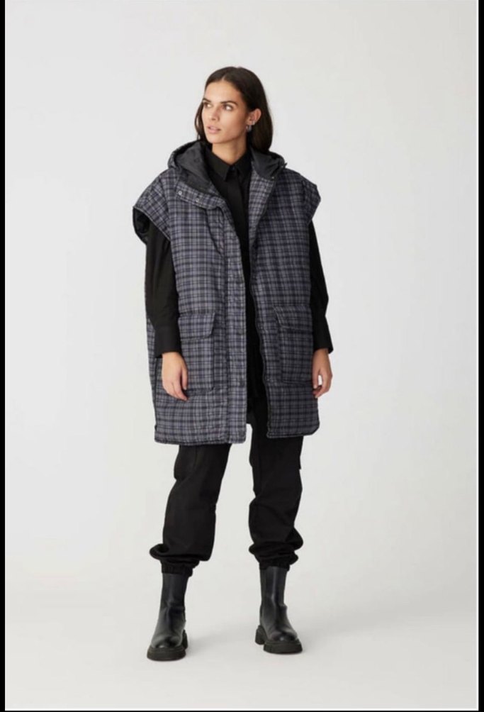 Gri ekose desenli,midi boy ve bol kesim şişme yelek.Çok tarz bir parça,sorunsuz.Standart beden.