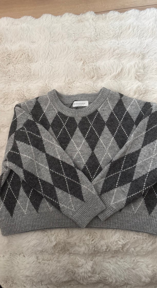 Gri renkte, ekose desenli triko kazak. Yuvarlak yaka, uzun kollu ve bol kesimdir. Günlük kullanıma uygundur.