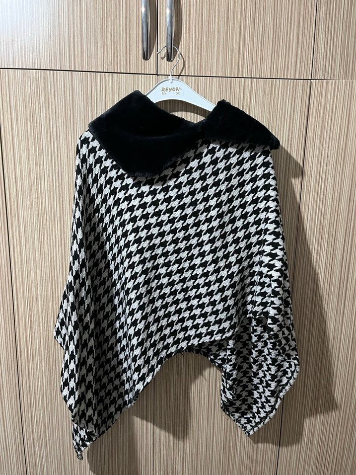 Gri ekoseli, yüksek yakalı ve uzun kollu kadın panço. Sentetik kumaştan örülmüş, rahat kesimli ve günlük kullanıma uygun şık bir tasarım.