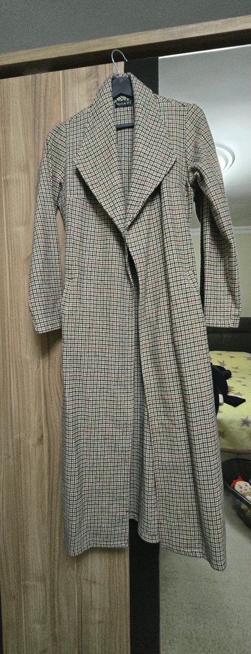 Gri ekose desenli kadın uzun kaban, geniş yakalı ve düğmeli. Uzun kollu, rahat kesim, yumuşak sentetik kumaştan, sokak tarzına uygun.