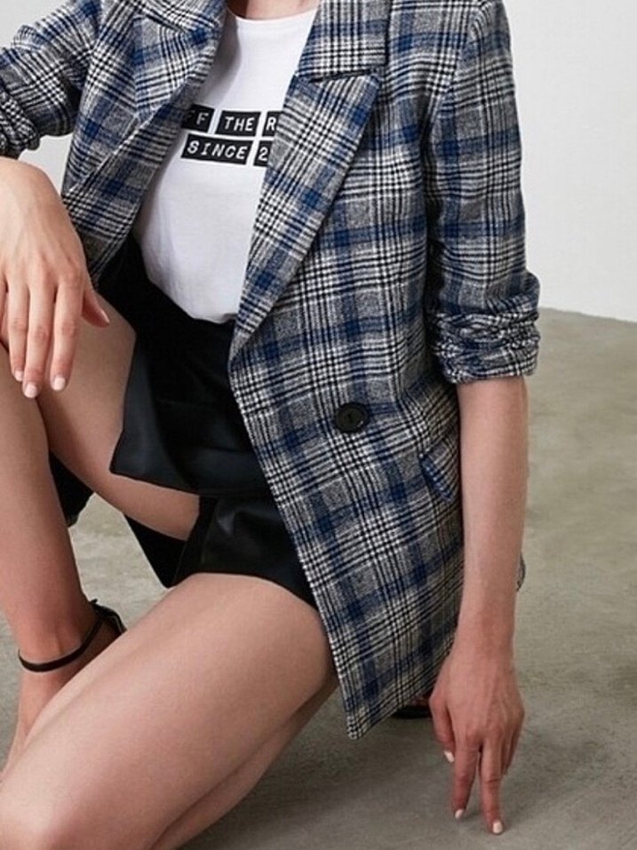 Gri ekose desenli, yumuşak yün kumaştan yapılmış kadın blazer. Düğmeli, normal kesim ve uzun kolludur, ofis ve günlük kullanıma uygundur.