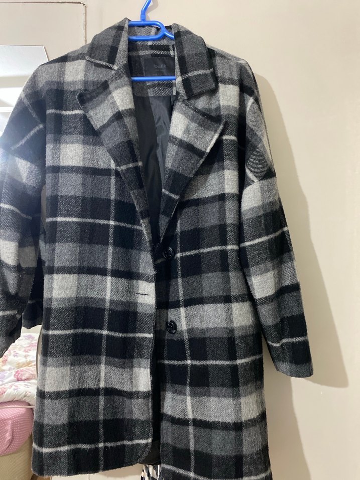 Düğmeli, gri tonlarında ekose desenli yün kadın kaban. Normal boy, uzun kollu, rahat kesimli ve notched yakalıdır. Sokak stiline uygun, günlük kullanıma idealdir. Tüylenmiş harici sorunu yok
