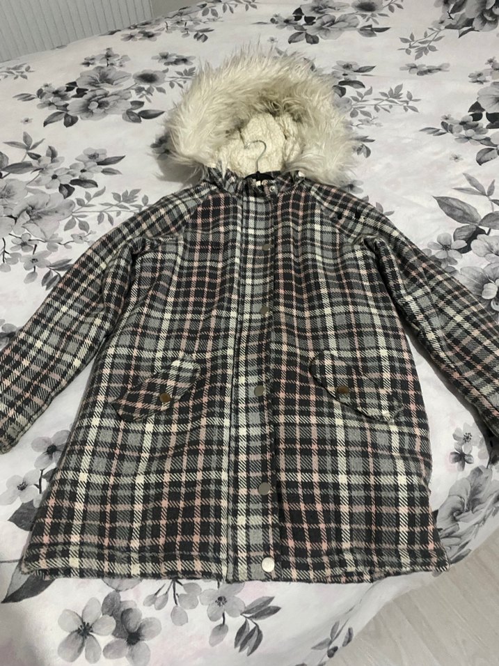 Bu kadın ceketi, kapüşonlu ve kürk detaylıdır. Gri ekose desenli, bol kesim, uzun kollu ve midi boyda, yumuşak ve sıcak kumaştan üretilmiştir.