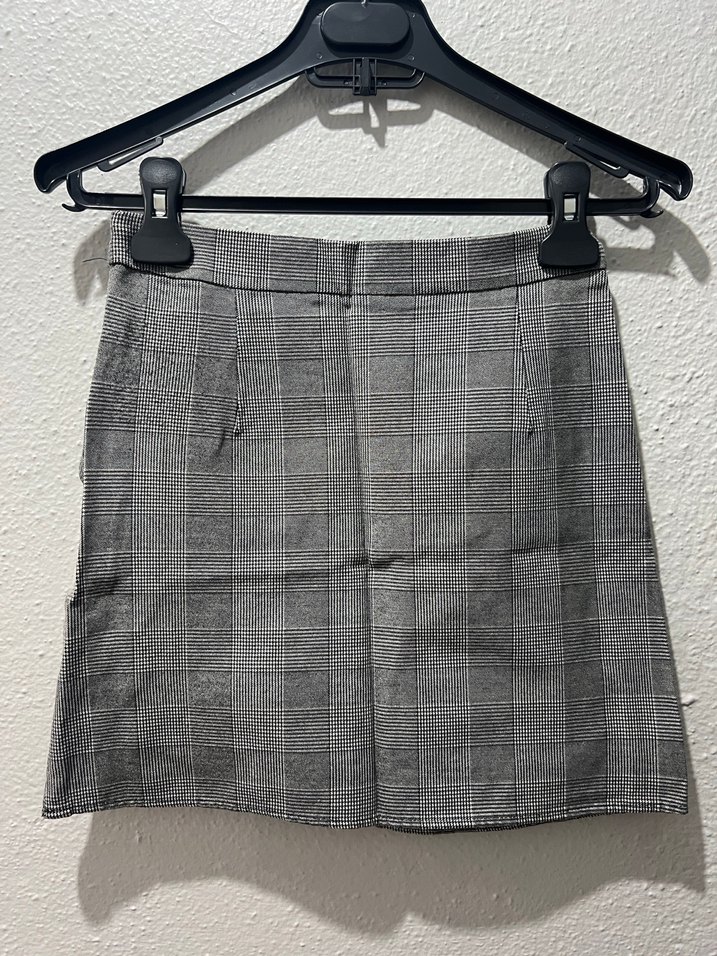 Gri ekose desenli mini etek, kemerli ve regular fit. Sentetik kumaştan, minimalist sokak stiliyle ofis ve günlük kullanıma uygun.
