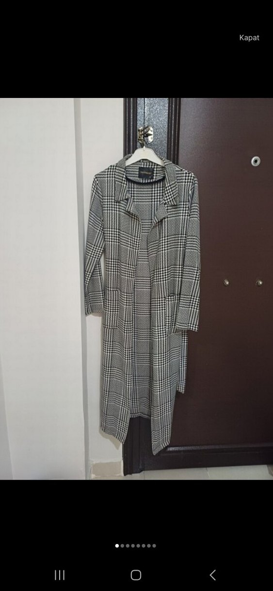 Uzun boy gri ekose desenli, kemerli ve kesik yakalı kadın kaban. Uzun kollu, rahat kesim, yumuşak kumaştan üretilmiştir.