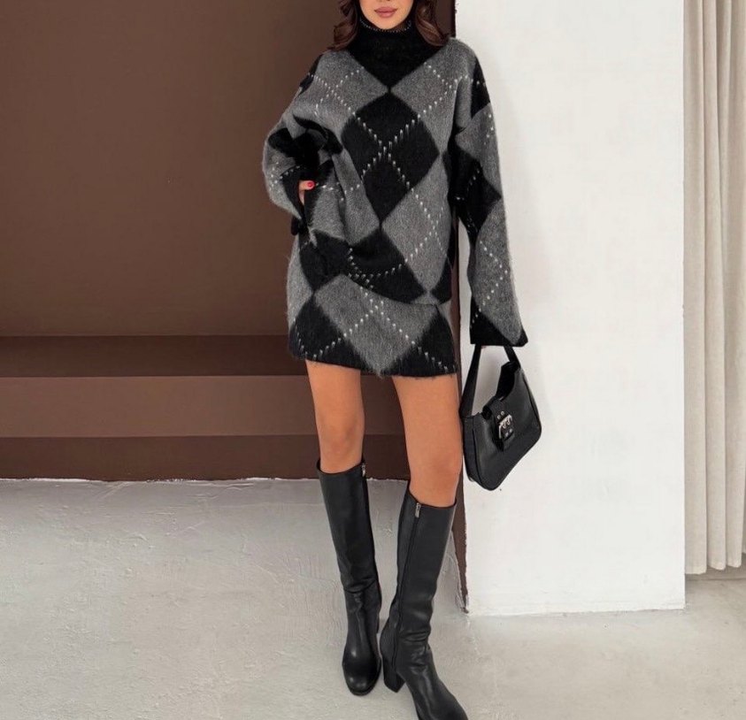 Gri ekose desenli, kısa boy, boğazlı ve uzun kollu kazak, rahat ve sıcak örme kumaştan üretilmiştir. Günlük sokak stili için uygundur.