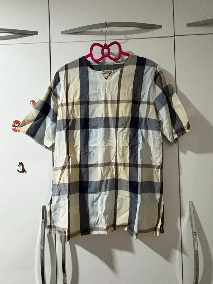 Kısa kollu, bol kesim ve yuvarlak yakalı kadın gömlek. Pamuk kumaştan, gri ekose desenlidir. Günlük kullanıma uygun rahat bir model.