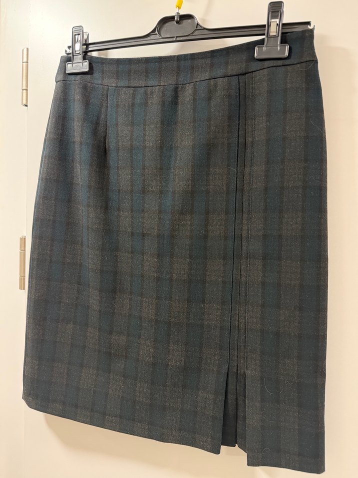 Gri ekose desenli midi etek, regular fit ve pileli detaylarla ofis kullanımı için uygundur.
