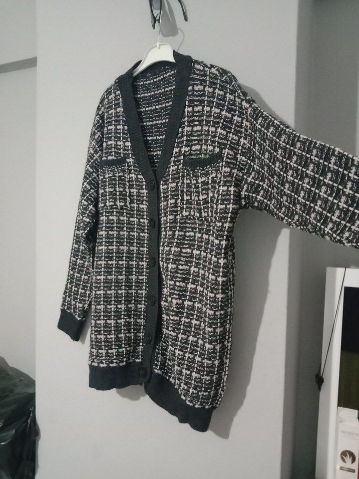 Gri ekose desenli örgü kadın hırka, notlu yakalı ve uzun kolludur. Salaş kesim ve normal midi boyda, rahat sokak stili için uygundur.