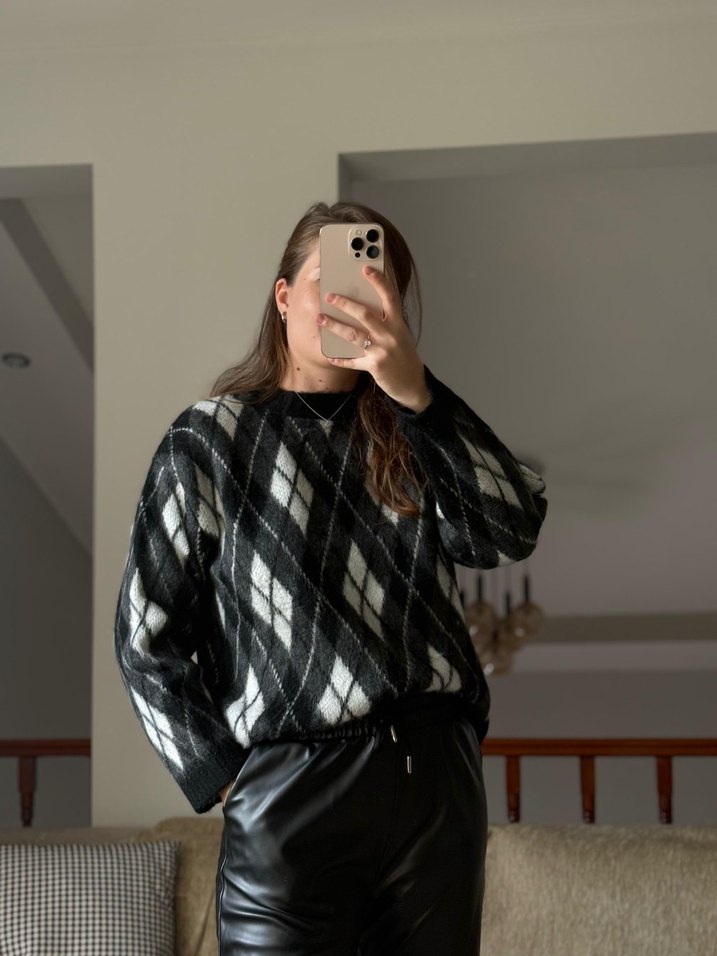 Gri renkte, ekose desenli, örgü malzemeden yapılmış, uzun kollu ve salaş kesim kadın kazak.