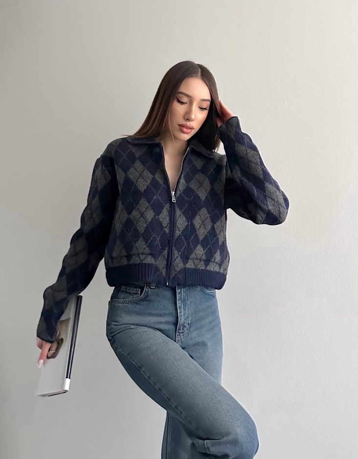 Gri Ekose Desenli Örgü Kadın Triko