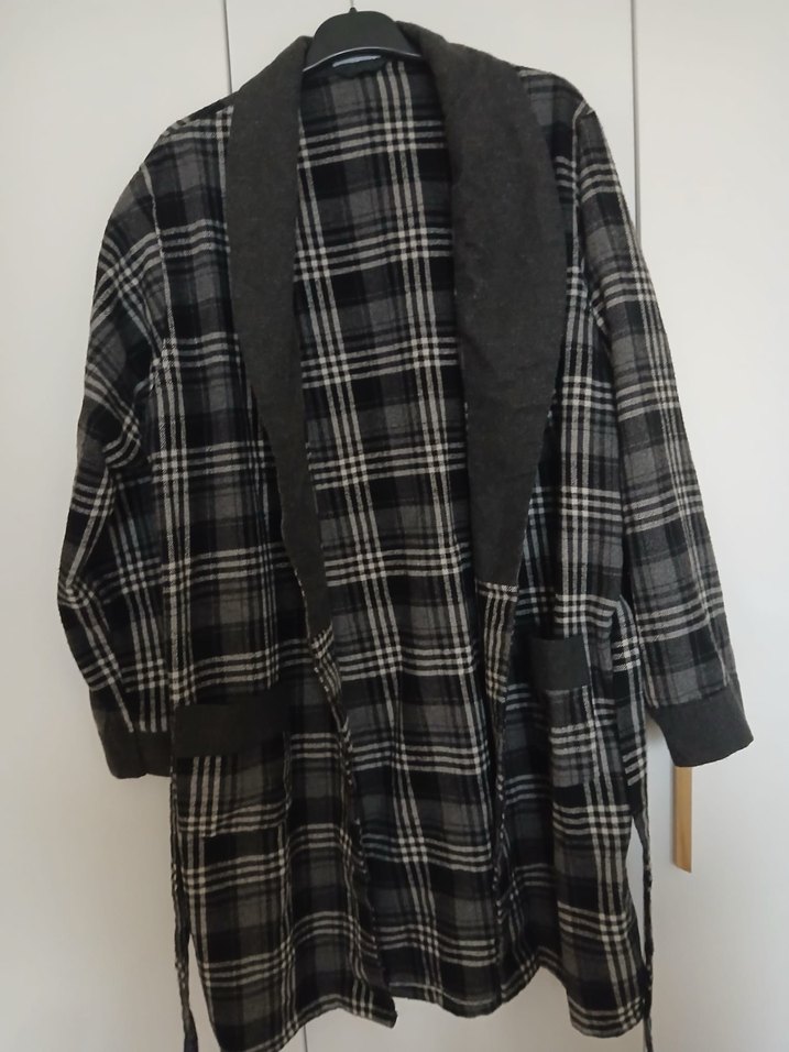 Gri ekose desenli pamuklu bornoz, düz şal yaka, uzun kollu, cepli ve bel bağlamalıdır. Evde rahat kullanım için uygundur.