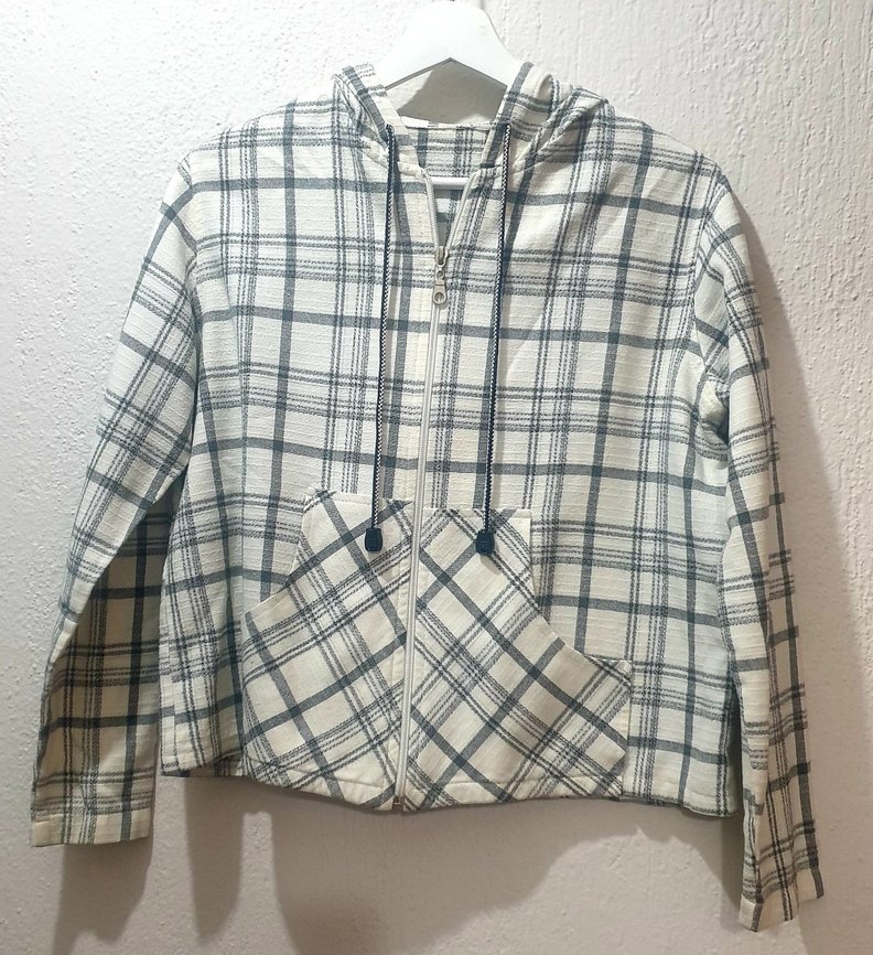Gri ekose desenli, uzun kollu, kısa boylu, duz kesim regular fit kadın spor ceket. Günlük kullanıma uygun rahat bir sokak stili parçası. spor uyumlu