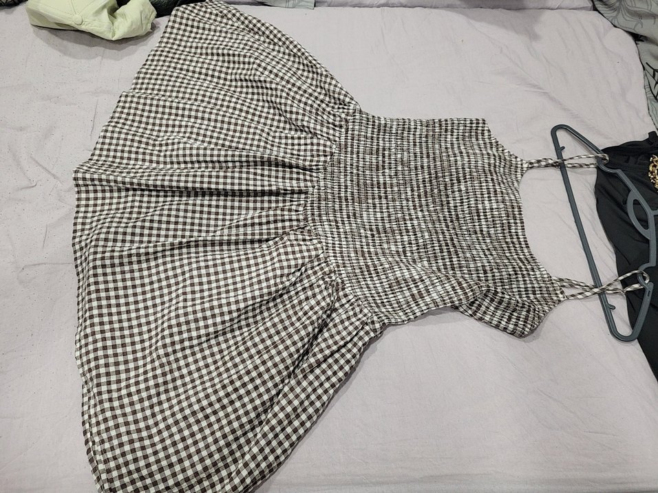 Gri ekose desenli midi elbise, pilili detaylar, tekne yaka ve ince askılı kollara sahiptir. likrali...elbise boyu 69 cm