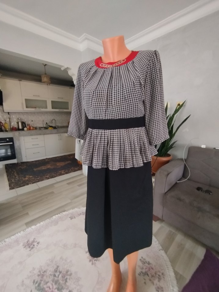 Gri ekose deseni, uzun kollu ve bisiklet yaka olan bu elbise pilili detaylarıyla ofis için uygun şık bir seçenektir.