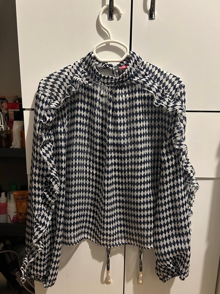Gri ekose desenli, pilili detaylara sahip, uzun kollu ve yüksek yakalı bol kesim bluz. Günlük kullanıma uygun rahat ve trend bir parça. M beden