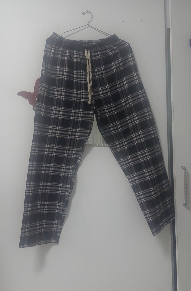Gri ekose desenli, bağcıklı bel detaylı, rahat kesim Erkek pantolon. Günlük sokak stiline uygun.