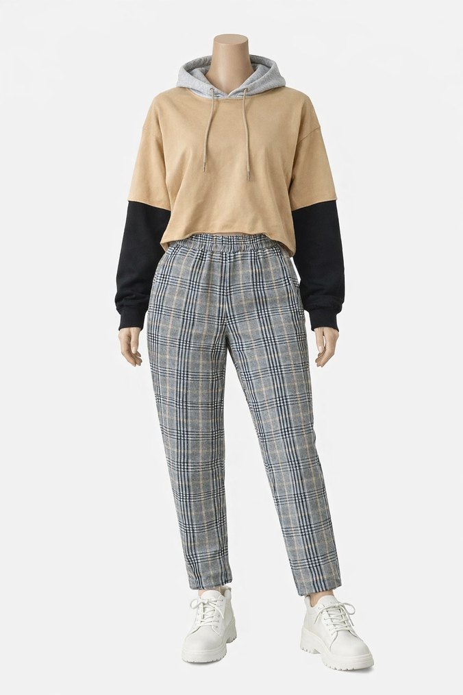 Gri Ekose Desenli Rahat Kesim Kadın Pantolon