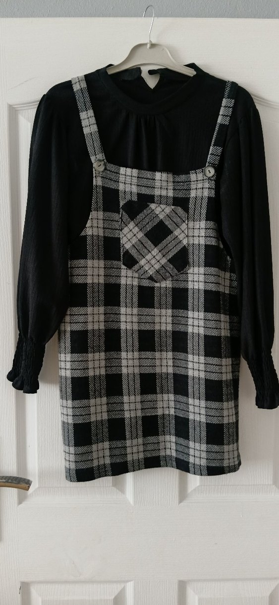 Gri ekose desenli, bol kesim, düğmeli askılar ve önde cep detaylıdır. Siyah uzun kollu üst ile kombinedir. Sentetik kumaştan, gotik tarzda.