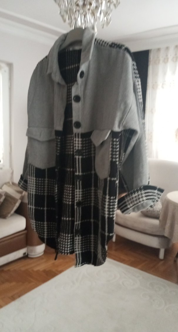 Gri Ekose Desenli Uzun Kadın Ceket Gömlek