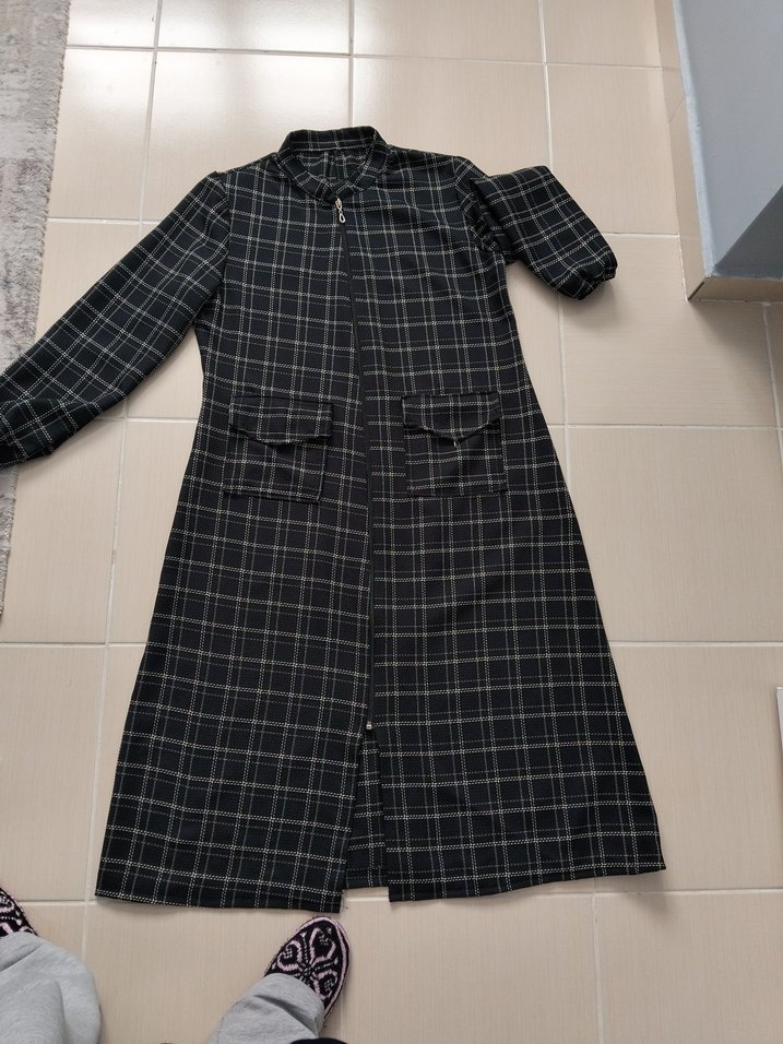 1.12 cm uzunluğunda L-40 beden Gri renkte, ekose desenli uzun kadın elbise. uzun kollu ve çentikli yaka detaylarına sahiptir. Rahat kesimiyle günlük sokak stili için uygundur.